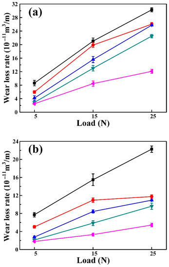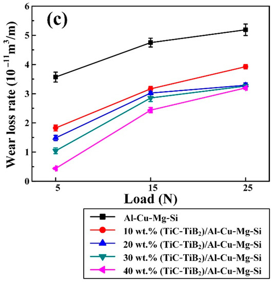 In the abrasive wear process, an increase in applied load would contribute to an increase in the contact zone between the specimens and the abrasives [35]. The penetration ability of the Al2O3 abrasives increased as well as the micro-ploughing efficiency, which caused the increases in the WRs for the matrix alloy and composites. This was confirmed by the worn surface, as shown in Figure 9; with severe plastic deformation, the grooves became deeper and wider in the matrix alloy and the composites when the applied load increased. It can be inferred that micro-ploughing was the main abrasive wear mechanism for the Al-4.7Cu-0.32Mg-0.44Si alloy and the (TiC-TiB2)/Al-4.7Cu-0.32Mg-0.44Si composites at an Al2O3 abrasive size of 40 µm.