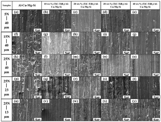 Worn surfaces of Al-4.7Cu-0.32Mg-0.44Si alloy and (TiC-TiB2)/Al-4.7Cu-0.32Mg-0.44Si composites tested under various loads and Al2O3 abrasive sizes. (a) Al-4.7Cu-0.32Mg-0.44Si alloy, (b) 10 wt.%, (c) 20 wt.%, (d) 30 wt.%, and (e) 40 wt.% (TiC-TiB2)/Al-4.7Cu-0.32Mg-0.44Si composites tested under load of 5 N and Al2O3 abrasive size of 40 μm; (f) Al-4.7Cu-0.32Mg-0.44Si alloy, (g) 10 wt.%, (h) 20 wt.%, (i) 30 wt.%, and (j) 40 wt.% (TiC-TiB2)/Al-4.7Cu-0.32Mg-0.44Si composites tested under load of 15 N and Al2O3 abrasive size of 40 μm; (k) Al-4.7Cu-0.32Mg-0.44Si alloy, (l) 10 wt.%, (m) 20 wt.%, (n) 30 wt.%, and (o) 40 wt.% (TiC-TiB2)/Al-4.7Cu-0.32Mg-0.44Si composites tested under load of 25 N and Al2O3 abrasive size of 40 μm; (p) Al-4.7Cu-0.32Mg-0.44Si alloy, (q) 10 wt.%, (r) 20 wt.%, (s) 30 wt.%, and (t) 40 wt.% (TiC-TiB2)/Al-4.7Cu-0.32Mg-0.44Si composites tested under load of 25 N and Al2O3 abrasive size of 23 μm; (u) Al-4.7Cu-0.32Mg-0.44Si alloy, (v) 10 wt.%, (w) 20 wt.%, (x) 30 wt.%, and (y) 40 wt.% (TiC-TiB2)/Al-4.7Cu-0.32Mg-0.44Si composites tested under load of 25 N and Al2O3 abrasive size of 13 μm.