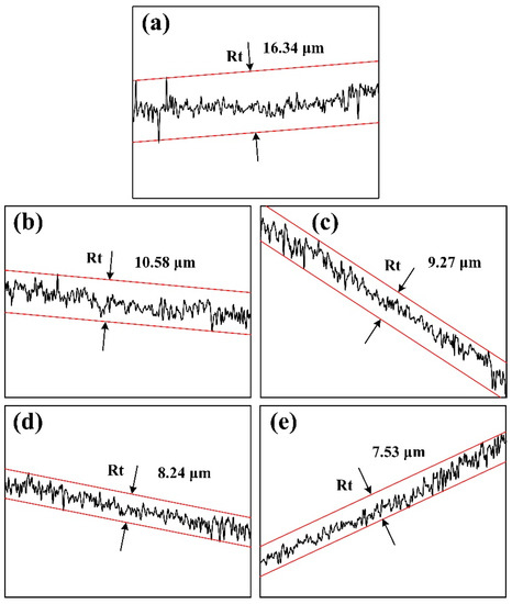 The roughness curves of (a) Al-4.7Cu-0.32Mg-0.44Si alloy and (TiC-TiB2)/Al-4.7Cu-0.32Mg-0.44Si composites with TiC-TiB2 particles content of (b) 10 wt.%, (c) 20 wt.% (d) 30 wt.% and (e) 40 wt.% under 5 N load and 13 µm Al2O3 abrasive size.