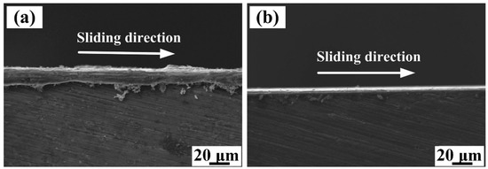 Figure 11a,b show cross-sectional SEM images of the worn scar for the Al-4.7Cu-0.32Mg-0.44Si alloy and the 40 wt.% (TiC-TiB2)/Al-4.7Cu-0.32Mg-0.44Si composite, respectively, at 5 N load and with 13 µm Al2O3 abrasive size. Abrasive damage was confined to the subsurface layer of the Al-4.7Cu-0.32Mg-0.44Si alloy and the composite specimens. As shown in Figure 11, the thickness of the cutting layer of the composite was significantly smaller than for the Al alloy.