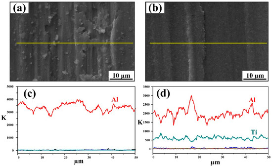 Figure 12 shows higher magnification images of the worn scar and corresponding line EDS results for the Al-4.7Cu-0.32Mg-0.44Si alloy and the 40 wt.% (TiC-TiB2)/Al-4.7Cu-0.32Mg-0.44Si composite. As shown in Figure 12a,c, scratches, deep grooves and bridges were observed simultaneously on the worn surface of the Al-4.7Cu-0.32Mg-0.44Si alloy, representing indicators of micro-cutting and micro-ploughing abrasive wear mechanisms. Figure 12d shows the uniform distribution of the Ti element, reflecting the homogenous distribution of TiC and TiB2 particles in the composite. The TiC-TiB2 particles significantly constrained the plastic deformation of the Al matrix and increased the wear resistance of the composite. The composite presented a much smoother worn surface than the Al alloy, as indicated in Figure 12.