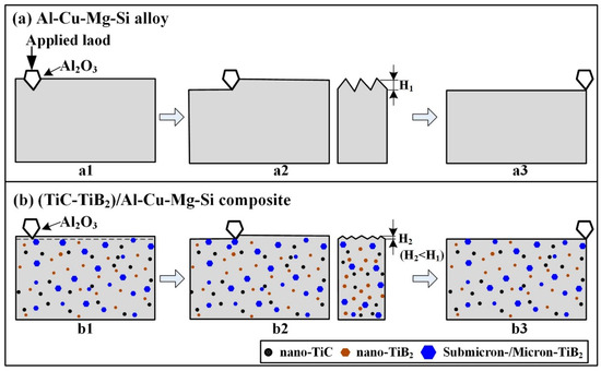Figure 13 shows an abrasive wear behavior schematic view of the Al-4.7Cu-0.32Mg-0.44Si alloy and (TiC-TiB2)/Al-4.7Cu-0.32Mg-0.44Si composite. In the abrasive wear process for the Al-4.7Cu-0.32Mg-0.44Si alloy, the Al2O3 abrasives penetrated the Al matrix, moved on the surface and generated the grooves (stage a2), subsequently converting the materials into debris and chips, as shown in Figure 13a. The abrasive wear loss of the Al matrix alloy occurred during the reciprocating movements of the Al2O3 abrasives (stage a3). Grooves and wear debris formed on the worn surfaces, as shown in Figure 9 and Figure 12. As shown in Figure 13b, the TiC and TiB2 particles effectively increased the micro-hardness of the composites, decreased the contact area between the matrix and the Al2O3 abrasives, and weakened the penetration and micro-cutting efficiency of the Al2O3 abrasives (stage b2). The TiC and TiB2 particles also played a role in the load-bearing elements, which effectively prevented the penetration of the abrasives and then increased the abrasive resistance of the composites [27,36]. Therefore, the composites with higher TiC-TiB2 particle content were able to show better abrasive resistance and a lower wear rate. As indicated in Figure 11, the thickness of the plastic deformation zone on the wear surface of (TiC-TiB2)/Al-Cu-Mg-Si composite was significantly smaller than that of the Al matrix alloy. Since the penetrating depth and micro-cutting efficiency of the abrasive particles increased with increase in the applied load and abrasive size [37,38], the micro-cutting efficiency of the abrasive particles was improved, leading to an increase in the WRs. When tested with a 13 µm abrasive size and under a 5 N load, the abrasive wear mechanisms were micro-cutting and micro-ploughing for the Al-4.7Cu-0.32Mg-0.44Si alloy, while micro-cutting was the main abrasive wear mechanism for the 40 wt.% (TiC-TiB2)/Al-4.7Cu-0.32Mg-0.44Si composite. The composite showed much superior abrasive wear resistance to that of the Al alloy (up to 4.17 times higher). As discussed above, with increase in the applied load (5 N to 25 N) or in the Al2O3 abrasive size (13 µm to 40 µm), the abrasive wear mechanism of the (TiC-TiB2)/Al-4.7Cu-0.32Mg-0.44Si composites changed from micro-cutting and micro-ploughing to micro-ploughing, with formation of much rougher and deeper furrows and much debris. The main abrasive wear mechanisms for the Al-4.7Cu-0.32Mg-0.44Si alloy and the (TiC-TiB2)/Al-4.7Cu-0.32Mg-0.44Si composites were micro-ploughing and micro-cutting.