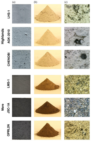 The authors used six LSSs (previously described in the literature) for laser measurements. Considering that future lunar structures will be located in different places on the Moon (highlands or mare regions), the LSSs used represented both regions. The highlands and mare regions are characterised by different mineral compositions of the regolith. The mare regions are richer in iron and titanium; therefore, they are darker than the highland regions, which consist of lighter silicate minerals [1]. The LSSs used in this study are listed in Table 1 and presented in Figure 1.