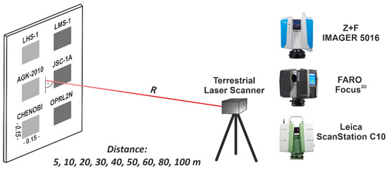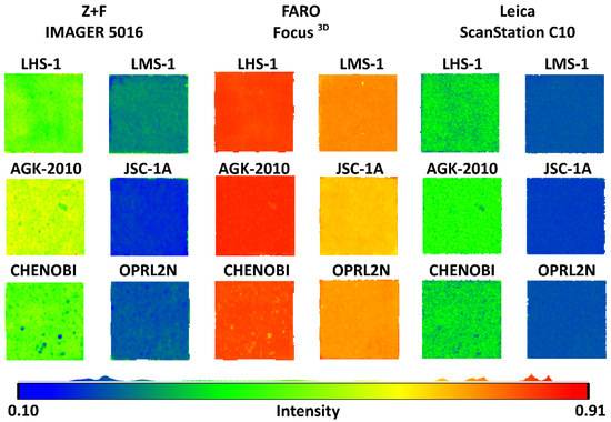 This study conducted laser scanning of LSS specimens in an outdoor environment (temp. +10 °C ± 1 °C; r.h. 50% ± 1%). Specimens were scanned at nine different distances (5, 10, 20, 30, 40, 50, 60, 80, and 100 m). These distances were selected based on the authors’ previous experience with the scanners [19,44] and LSSs [29,30]. A TLS measurement from a distance of up to 100 m is sufficient for the construction of future habitats and structures on the Moon. During the measurements, the laser beam struck the LSS specimens perpendicularly. The incidence angle of the laser beam ranged from 0° to 2° and did not affect the values of the intensity (see Equation (1)). A schematic of the measurement setup is shown in Figure 2. As an example, the full results of the LSS measurements from a distance of 5 m are presented in Figure 3.
