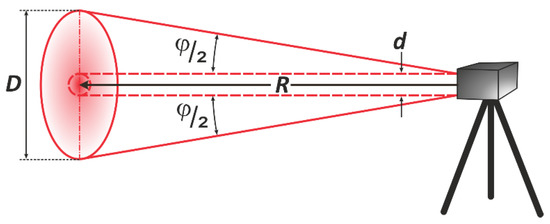 To post-process the point clouds, it was necessary to determine the appropriate tested area for each LSS specimen. In this study, it is important to note that the laser beam is divergent. Thus, the area of a tested specimen is “effective” when the entire laser spot hits it during the measurement. The spot size of the laser beam is a function of the beam waist on the expander (d), beam divergence (), and distance (R). The spread of the laser beam emitted by the laser transmitter is shown in Figure 4. The theoretical laser beam diameter (D) and area (A) covered by a beam when it reaches a target can be calculated using Equations (2) and (3), respectively [47].