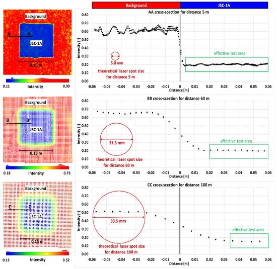 The size of the laser spot affects the quality and precision of the measurement. A situation often occurs in which the footprint of a laser beam on a surface covers an area including two or more objects [48]. These objects can be in one plane or at different distances. The reflected energy cannot be associated with one of these objects, but is interpreted as a weighted average value. Two objects with different surface properties typically exhibit dissimilar reflective properties. An object comprising a larger area of the laser footprint will have a larger effect on the laser beam energy returned. To determine the effective LSS area of the tested samples, the point clouds from JSC-1A target measurements were analysed in detail. Additionally, a detailed analysis was undertaken by creating cross-sections from narrow strips 0.008 m wide across the plate (called the background) and the JSC-1A specimen. In Figure 5, the measurement results for the three distances of 5, 60, and 100 m are presented. By analysing Figure 5, the effective area of the LSS specimen can be easily determined. It was decided to use the LSS area in which the entire laser spot hits the desired surface. The effective area of the LSS varied at different distances. The smallest effective area of an LSS specimen occurred at a distance of 100 m. For this case, the effective area was approximately 0.035 m based on the boundary between the background and JSC-1A specimen. Therefore, the same square area equal to 0.08 m × 0.08 m was adopted for all samples.