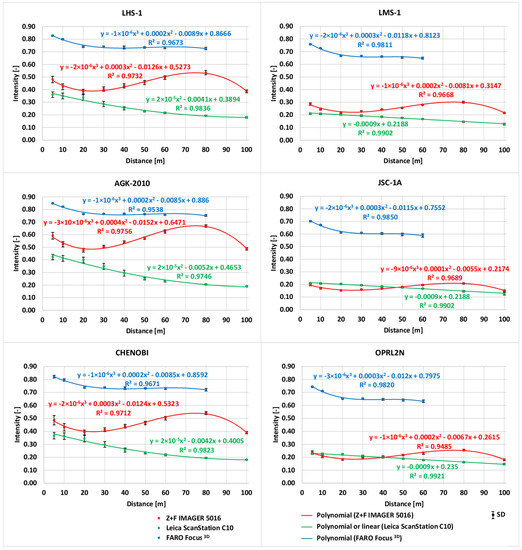 A total of nine measurements of six LSS specimens were performed using three scanners. In the case of the FARO Focus3D scanner from a distance of 100 m, no point clouds were recorded for any of the LSS specimens. From a distance of 80 m, the scanner did not register point clouds for three of the LSS specimens (LMS-1, JSC-1A, and OPRL2N). The recorded data were processed using the CloudCompare software (cloudcompare.org) to analyse the intensity values. The collected intensity datasets of the LSS specimens were statistically analysed and used to create intensity–distance plots. In Figure 6, the mean values of the intensity, standard deviations, and fitted functions of the datasets are presented.