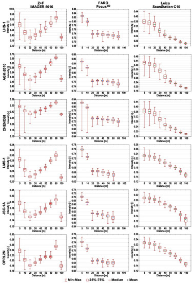 It is clear that the intensity values registered by the FARO Focus3D are significantly higher than those registered by the Leica ScanStation C10 and Z+F IMAGER 5016. Nevertheless, some of the scans of the LSS specimens at distances of 80 and 100 m were not registered by the FARO Focus3D scanner. It should be noted that this scanner had the shortest measuring distance of up to 120 m (see Table 2). For all of the LSS specimens scanned with the Leica ScanStation C10, the decrease in the intensity value is directly proportional to the increase in the measuring distance. This relationship can easily be described using a linear or quadratic polynomial function. In the case of the Z+F IMAGER 5016, the intensity value gradually decreases proportionally to the increase in the measuring distance, reaching minimum values at a distance of 20 m. For longer distances, the intensity value gradually increases proportionally to the increase in the measuring distance, reaching its peak at a distance of 80 m. The intensity values at a distance of 100 m are significantly lower than those obtained at 80 m. In the authors’ opinion, the scanner reached its registration capabilities at this distance. This relationship can be described using a cubic polynomial function. It is clear that the intensity values are much higher for LSS specimens that represent lunar highlands (LHS-1, AGK-2010, and CHENOBI) than those that represent lunar mare regions (LMS-1, JSC-1A, and OPRL2N). This means that the mare LSSs (characterised by a darker colour) absorb more of the laser beam energy. This phenomenon is especially visible for the Leica ScanStation C10 and Z+F IMAGER 5016.