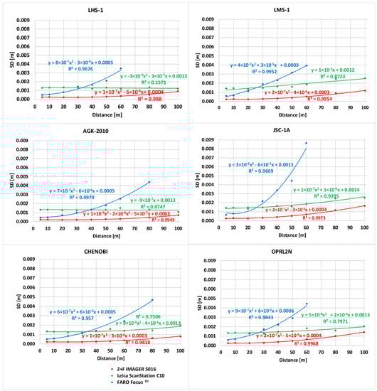 Among the important parameters for determining whether TLS can be used for specific purposes is the precision and maximum feasible measurement distance. The type of scanned material affects the intensity value and, thus, affects the precision and maximum feasible distance of a measurement [50]. The effect of individual LSS specimens on the precision of TLS measurements conducted at various distances was investigated. The mean sum error (MSE) method presented by Chen [51] was used to determine the precision of the distance measurement for LSS targets. The LSS targets were assumed to be flat and homogeneous surfaces. The plane was fit based on the 3D coordinates of the points. The calculated distances, di, of all points from the surface were considered as the real precision of the distance measurement. The computed standard deviation (SD) of di was assumed to be the mean error of the distance measurements to the LSS targets. A complete analysis of the SD is presented in Figure 8. It is clear that the measurements conducted using the Z+F IMAGER 5016 scanner are characterised by the lowest error (SD) of the distance measurement. For highland LSSs (LHS-1, AGK-2010, and CHENOBI), the error of the distance measurement was less than one millimetre in all cases (regardless of the distance). For mare LSSs (LMS-1, JSC-1A, and OPRL2N), the error was slightly greater, but still did not exceed 2 mm. The error in the distance measured using the Leica ScanStation C10 scanner was slightly higher than that of the Z+F IMAGER 5016 scanner for highland LSSs (for all distances). The error ranged from 1 to 2 mm. Similar to the Z+F IMAGER 5016 scanner, the measurements conducted using the Leica ScanStation C10 scanner for mare LSSs were characterised by slightly larger errors in the distance measurement in comparison to the highland LSSs. The higher error in the distance measurement for the Leica ScanStation C10 scanner compared to the Z+F IMAGER 5016 scanner is understandable, as the two scanners use different types of rangefinders (TOF and PS, respectively). The results for the FARO Focus3D scanner were the worst and were difficult to comprehend. The FARO Focus3D scanner uses a PS rangefinder; therefore, it should have a distance measurement error similar to that of the Z+F IMAGER 5016 scanner. It should be noted that the maximum measurement distance of the FARO Focus3D scanner is only 120 m. The increase in the error value of the distance measurement (relative to the increase in distance) was the most obvious for this scanner.