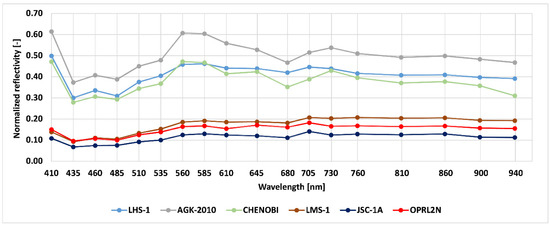 The investigation of the radiometric behaviour of LSSs in terrestrial laser scanner measurements is a first step toward their future utilisation on the Moon. In the authors’ opinion, future research should focus on the performance of TLS measurements associated with the erection of lunar habitats. Terrestrial laser scanners use lasers with different wavelengths; thus, the wavelength that is most appropriate for lunar applications should also be considered. A spectrometer can be used for this purpose, as a spectrometer can capture the intensity of the reflected light for a given wavelength. Currently, spectroscopy techniques are widely used for measuring the chemical and physical properties of materials, such as soil monitoring [55] and water stress in plants [56]. The device created by the research team for the future research consists of a SparkFun Triad Spectroscopy Sensor, Niwot, Colorado, USA (AS7265x consisting of three spectral sensors: AS72651 (UV), AS72652 (WHT), and AS72653 (IR)) and a Microcomputer Arduino Nano V3.0 ATMEGA328P (arduino.cc). It can detect light with wavelengths from 410 nm to 940 nm [57]. The sensor can provide information about how a surface absorbs and reflects light of different wavelengths (at 18 individual light frequencies). Each LSS was tested separately using the SparkFun. The sensor was placed face-down on each LSS target, and measurements were recorded during a period of 20 s. To eliminate the effects of ambient light, the AS7265x sensor was placed in a specially prepared protective shell (Figure 9a). In Figure 9b, the spectrometer devices during the measurement of a sample of the JSC-1A LSS are presented. Apart from the LSS specimens, white paper was also measured as a basic Lambert material. The raw measurement data for the LSS specimens were normalised with respect to the white paper.