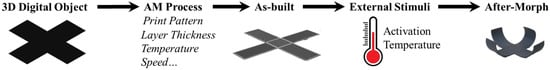 Smart materials that respond to external stimuli by changing shapes and sizes are among the most popular 4D printing applications. Among these smart materials, SMPs are the most widely used and easy to work with, as they can trigger shape change through heat or solvent stimuli. One of the examples is the water-responsive SMPs-hydrogels, which have been used as 4D printing materials when exposed to water. The other type of SMPs is thermo-responsive and can deform through heat/temperature. Besides the smart materials, the other widely used 4D technologies rely on multi-material printing by utilizing the different thermos-mechanical behaviors to achieve shapeshifting. In contrast, some other researchers [6] programmed the manufacturing patterns on a single material to achieve the anisotropic behavior for morphing. However, these 4D printing production approaches are based on a random design using trial and error methods, which lack robustness control. Furthermore, to analyze the deformation due to the various sources of the environmental simulants, some finite element analysis (FEA) [7] uses the material distribution per layer, but this process is costly and needs huge computational power and lacks control over the shape-change. Therefore, a deep understanding of the intersection of the process and the resultant performance for the self-morphing behavior is urgently needed. The developed process–performance framework can provide dual-way informing and guiding of the 3D print shapes and their associated deformation. A comprehensive digital-to-product 4D printing manufacturing process is presented in Figure 1.