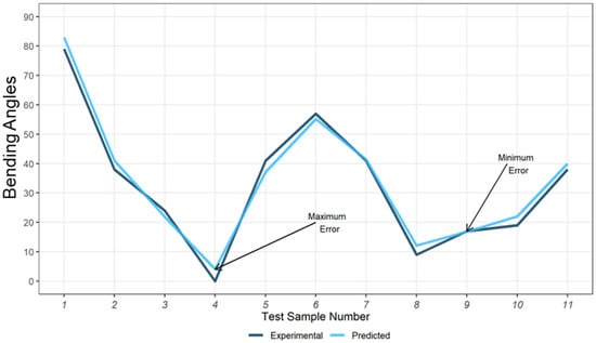 In Figure 5, the minimum and maximum prediction errors are indicated on the graph. The bending angle prediction model based on the three controlling factors (layer thickness, printing pattern, and speed) also presented a which verifies the effectiveness and accuracy of the model.