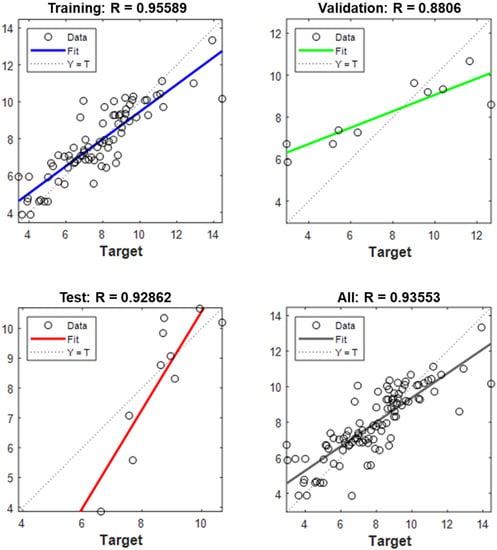 Curvature, the other indicator of the self-morphing performance, has been predicted using the artificial neural network model, and the are presented in Figure 6 based on the training, validation, and the test data. The neural network framework is defined by the training data. The number of layers and neurons are determined by the number of data points in the training set. The input layer will be connected to the output layer, and the hidden layers will be connected to the input layer and the output layer. The neurons in the hidden layers will be connected to each other. The weights of the connections will be determined by the training data. The overall which also shows that the neural network model provides the sounding results.