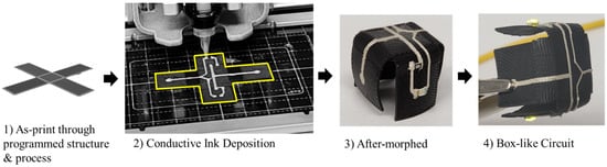 The programmed electronics are presented as a further application to present the capability of the proposed 4D-printing process. Current circuit printers are known to deposit conductive inks on a flat/planar surface. This hinders the design complexity of electronic devices. However, the conductive ink can be deposited to the pre-morphed shapes and activated through the environment to ultimately achieve complex geometries. Figure 7 presents a box-like circuit structure through the proposed methodology.