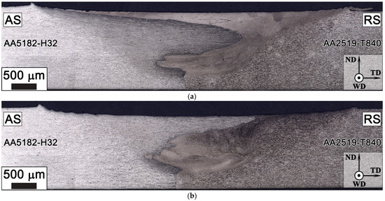 Macrographs of the transverse cross section of the produced joints are presented in Figure 3. It is evident from the micrographs that the selected FSW parameters produced defect-free structures. As AA2519 and AA5182 alloys have different etching responses, the metal flow from two sides was clearly visible in the welded joins. Interestingly, because grain refinement took place at the stir zone, the grain boundaries are difficult to distinguish.