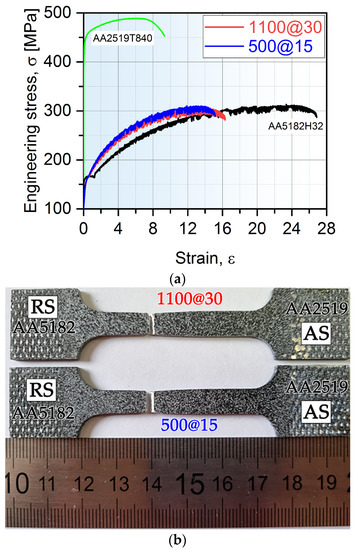 It is not surprising that tensile specimen fractured from the weakest point in the softer region, i.e., in the weaker AA5182 (as be will be shown in Figure 4 and Figure 5), away from the weld. This indicates that joints are free of defects and the achieved joint efficiency is around 100% (based on alloy AA5182). This is much higher than what can be achieved with electron beam [5,32,33] and TIG [8] welding processes. The presented data agree with the results obtained in dissimilar FSWed joints of AA2219 and AA5083 [6,13,14,16,17,18].