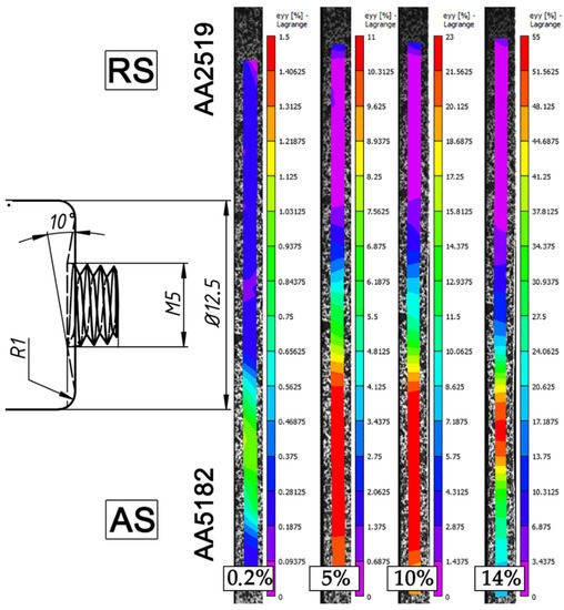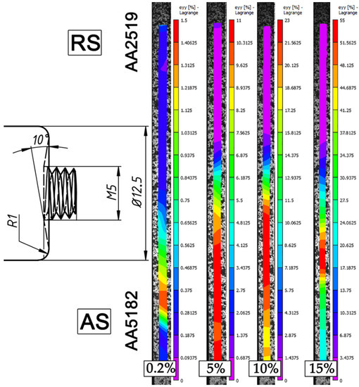 Figure 6 and Figure 7 display series of images showing the variation in local strain distributions in the tensile direction (εyy) over the gauge length of specimens of dissimilar FSW joints. The images were obtained with digital-image correlation measurements during tensile testing. As expected, the strain distribution is non-homogeneous, which is caused by the heterogeneous microstructure across the dissimilar joints. It is clearly seen that predominant tensile strain increasingly concentrates in the HAZ of the AA5182 side, where the lowest hardness appears (Figure 4). On the other hand, AA2519 experienced almost no plastic strain.