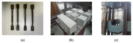 Details of the material properties test. (a) Tensile coupons; (b) ALC blocks; (c) universal hydraulic testing machine.