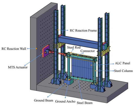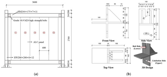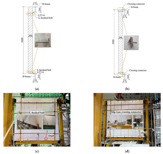 The ALC panels’ connection type included an L-hooked bolt and a slip-type crossing connector. The detailed connection measurements of external ALC panels to assembled steel beams are shown in Figure 3a,b. Figure 3c,d shows the site of testing.