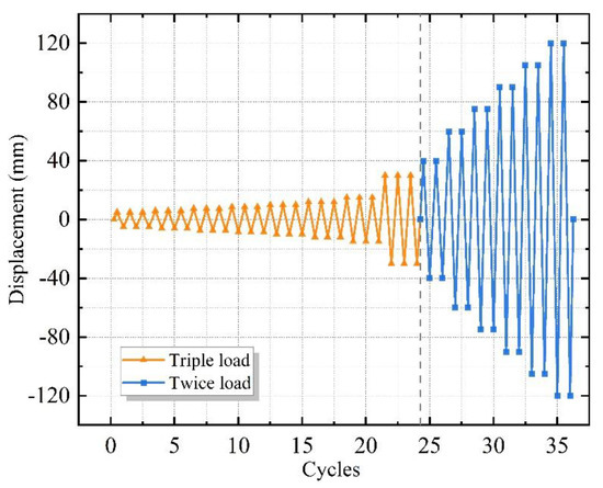Figure 4 shows the test loading devices, and the test was conducted at Anhui Province’s Key Laboratory of Building Structure and Underground Engineering. The horizontal load was applied to the structural frame by MTS, based on the current Chinese code JGJ/T 101-2015 ‘Specification for the seismic test of structures’ for the loading history of all specimens [26]. Figure 5 presents the test loading system. The control of displacement was employed for loading. Three cycles were enforced at each horizontal displacement level of 5–30 mm, and two cycles at each displacement level of 40–120 mm.