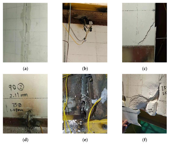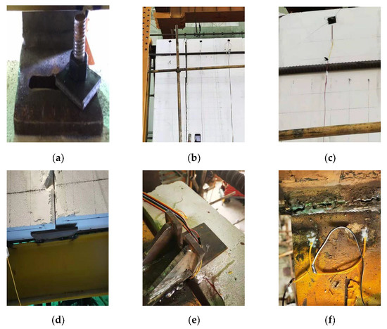 Phenomena during the test of JD-1. (a) Relative Sliding within bolt holes; (b) separating between the panels; (c) cracks at the bolt hole; (d) dislocation of ALC panels; (e) crushing of ALC panel near the upper connector; (f) weld fracture.