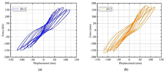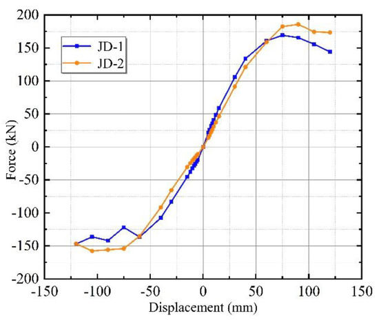 The MTS loading system recorded the hysteresis curve of the horizontal load–displacement relationship at the top of the specimen during the test. Figure 8 shows the hysteresis curve of JD1 and JD2. The hysteresis curves of both specimens were relatively full. The bearing capacity of specimen JD-2 after 60 mm was greater than that of specimen JD-1 under the same lateral displacement conditions. Meanwhile, the overall area of the hysteresis curve enclosure in JD-2 was greater than that in JD-1.
