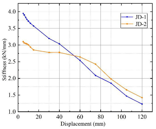 The stiffness degradation curves of specimens JD-1 and JD-2 are shown in Figure 10. It can be seen from Figure 9 that the initial secant stiffness of specimen JD-2 (3.10 kN/mm) was 78.6% of that of specimen JD-1 (3.95 kN/mm). This is because the L-hooked bolts, as rigid connection connectors, limited the relative displacement of the wall panel and the main structure in the initial stage. Thus, the wall panel of specimen JD-1 contributed more to the pre-stiffness. In contrast, the slip-type crossing connector bolt slipped in its limit hole and released the harmful displacement early, while the initial stiffness was less than that of specimen JD-1.
