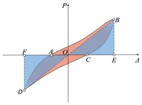 When a structure is subjected to seismic loading, whether the specimen can absorb the seismic release energy well is an important indicator of its seismic performance [28]. The better the structure’s overturning resistance, the more energy it dissipates. In this paper, the energy dissipation capability was determined by calculating the equivalent viscous damping ratio of the specimens, as shown in the following equation [29] and Figure 10: