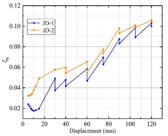 As shown in Figure 12, the equivalent viscous damp ratio (ξe) of JD-1 and JD-2 was between 0.0175–0.1031 and 0.0322–0.1056, respectively. The trend of curves at the start of loading was linear growth. The damage phenomenon of the ALC external wall panels of specimen JD-1 was more advanced in the instance of larger deformation of the steel frames, so the equivalent viscous damping ratio decreased in the early 0–10 mm of loading. The changing trend of both specimens gradually increased during the loading process; however, ξe of JD-2 was larger than that of JD-1 at each level load. Specimen JD-2 dissipated energy mainly through the relative slip between the connectors and the wall panels, while specimen JD-1 only allowed the rotation at the connectors.