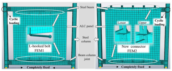 Based on the proposed external ALC panel steel frames with different connection methods, finite element analysis was performed by ABAQUS software. A hexahedral linear reduction integral solid element (C3D8R) was employed to simulate the ALC panels, connectors, bolts, steel beams, and steel columns [31]. A linear truss element (T3D2) was used to simulate the internal reinforcing bars of the ALC panels. Considering the calculation accuracy of the model, the mesh was encrypted at the holes of the connectors, bolts, and ALC panel holes. The finite element models of two types of external ALC panel steel frames are shown in Figure 13. A tie constraint condition was used to define the constraint relationship between the connectors and the steel beam. The constrained type of the other interaction among flat combination frame, L-hook bolt connector, new connector, steel bolt, and ALC panel was set to hard contact. The friction behavior between the ALC panels used a penalty function with a friction coefficient of 0.3 and the friction coefficient of 0.2 is taken between the ALC panel and connector. The internal double-layered reinforcement was embedded into the ALC panel using the Embed command condition [32].