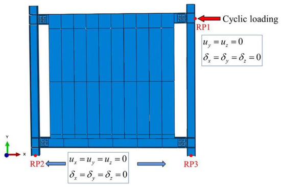 Figure 14 illustrates the loads and boundary conditions in the finite element model. The control of displacement was adopted for horizontal cyclic loading. The coupling points RP1, RP2, and RP3 were located at the center extension of the frame beam and the bottoms of both steel columns, respectively. The constraints and loads on the coupling points were specified in accordance with the actual boundary conditions, including rotational constraints and displacement constraints (δx = δy = δz = ux = uy = uz = 0) at the bottom of the columns, as well as rotational constraints (δx = δy = δz = 0) and displacement constraints in the y and z directions (uy = uz = 0) at the loading point.