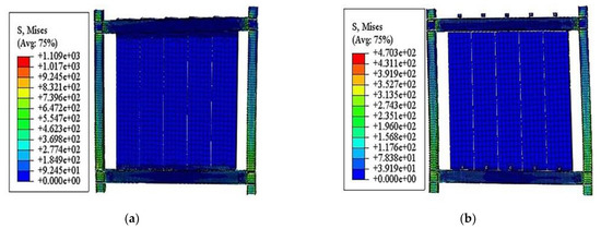 Figure 15a,b shows a stress cloud diagram of the specimens in the simulation. The stress concentration points in the model were mainly found near the beam-column nodes and bolt holes, consistent with the damage phenomenon of the test specimen. The results were verified by comparing the finite element analysis results with the experimental results. In the hysteresis curve results, the curves’ “pinch” impact was more pronounced in the experimental results than in the simulation results [34]. The initial stiffness was slightly lower than the value obtained from the simulations. All of the above differences, however, were within a reasonable range, and the finite element simulated results agreed with the experimental results.