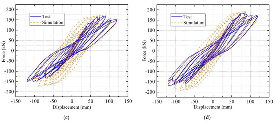 Figure 15c,d presents the load–displacement hysteresis of the specimens in the test and simulation. In the experimental hysteresis curve results, the positive loading energy consumption was greater than that of the negative loading, while the residual deformation was smaller than that of the negative loading phase. The ABAQUS finite element simulation results were slightly better than the experimental results due to the influence of the steel frame footing and ALC panel reinforcement slippage. Therefore, the results of the established FEMS model match the experimental results and reflect the seismic performance of the structure more accurately, which can be used for further parametric analysis.