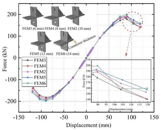 Figure 16 illustrates the skeleton curves of the above five connectors with different thicknesses. The specimens were at the elastic stage, and the curves overlapped when the loading displacement was small. The curves of the five groups gradually diverged as the loading displacement increased, indicating that the different stiffness contributions of the ALC wall panel and steel frame in the working phase of the connector produced variability. Among these five specimens, the FEM3 group reached the peak load first, and the ultimate bearing capacity decreased by 4.4% in comparison to FEM2 and by 7.7% compared to FEM6. The skeleton curves were all S-shaped, with a descending segment and roughly the same descending trend on each curve. The results show that the influence of slip-type crossing connectors on the structure’s bearing capacity improved as the thickness increased, but the effect was subtle.