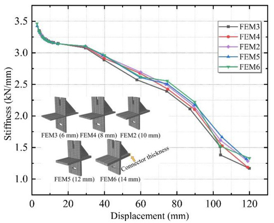 Figure 17 illustrates the stiffness degradation curves of the above five connectors with different thicknesses. The overall trend of these curves is consistent. Before the loading displacement of 30 mm, the stiffness degradation curves of the five simulated groups were not significantly different but diverged after the loading displacement rose. The stiffness contribution of the working phase of the connectors of different thicknesses to the ALC wall panels and steel frames did not vary linearly with increasing thickness. It followed from the parameter analysis of FEM2 and FEM3-6 that the initial stiffness of the specimens with the greater thickness were slightly higher, but the rate of stiffness degradation throughout the loading phase was faster.