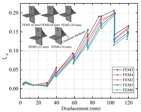Figure 18 shows the equivalent viscous damp ratio of the above five connectors with different thicknesses. Each specimen’s equivalent viscous damping coefficient increased continuously as the structure entered the yielding stage. At the later stage of loading, as the number of cycles of low circumferential reciprocal load increased, the difference between the curves of each specimen got larger. Thus, it is further inferred that with the smaller connector thickness of the planar composite frame, it can better absorb the seismic load in the earthquake. In addition, the energy dissipation capacity is worse if the thickness is greater. It indicated that it would be more reasonable to use the FEM3, which is the most economical solution for engineering.