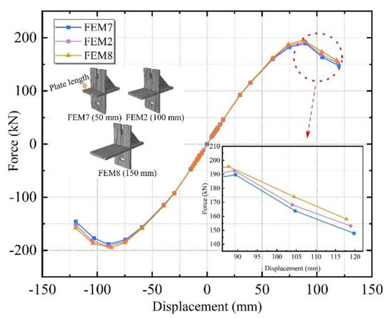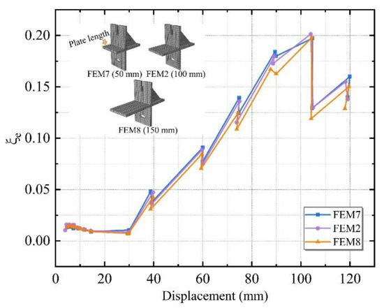 Figure 21 shows the equivalent viscous damp ratio for the above three specimens with different plate lengths. The equivalent viscous damp ratio of each group was compared. No significant differences were found in the equivalent viscous damp ratio of the three simulated groups before the loading displacement of 30 mm, and there was a significant increase after 30 mm. The difference was greatest when the loading displacement was 75 mm. This implies that the FEM7 group had a higher energy dissipation capability than the other two groups. The best energy dissipation capacity is achieved when using 50 mm of plate length. It is further inferred that the proper reduction of the plate length can enhance the specimens’ energy dissipation capability and can be employed as an optimization scheme in engineering.
