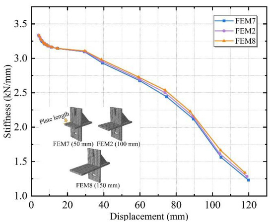To further verify the connector optimization, the stiffness degradation of the three groups was compared. The stiffness degradation curves of the above three specimens with varying plate lengths are shown in Figure 20. The stiffness degradation trends remain the same for the three cases of 50, 100, and 150 mm plate lengths, and the difference in secant stiffness values between the groups was small for the same displacement.