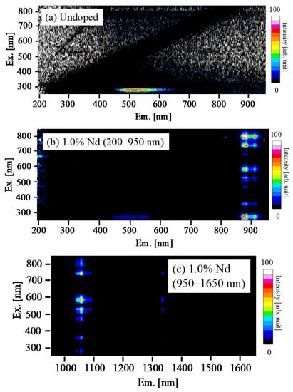 PL excitation and emission mapping of (a) undoped, (b) 1.0% Nd-doped BSO crystal in the emission range of 200–950 nm, and (c) 1.0% Nd-doped BSO crystal in the range of 950–1650 nm. The horizontal and vertical axes show the emission and excitation wavelengths, respectively.