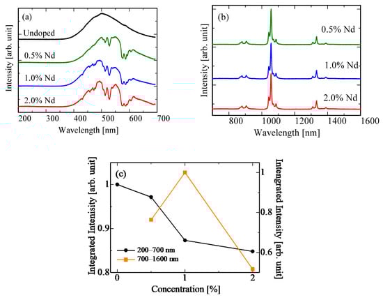 Figure 4 shows the X-ray-induced scintillation spectra of the undoped, 0.5, 1.0, and 2.0% Nd-doped BSO crystals in the range of 200–700 nm and 700–1600 nm. In the range of 200–700 nm, the emission band was observed at 400–700 nm. This emission band was due to the 6p–6s (3P1–1S0) transitions of Bi3+ ions [,]. Regarding the Nd-doped samples, a decrease in emission intensities at some wavelengths (e.g., ~580 nm) was observed at the emission band of the BSO host in 400–700 nm. The wavelengths where the decrease was observed were consistent with the PL excitation peaks due to the 4f–4f transitions of the Nd3+ ions. Figure 4c shows the integrated intensities of undoped, 0.5, 1.0, and 2.0% Nd-doped BSO crystals in the range of 200–700 nm after normalization by the maximum intensity. Generally, intensities of X-ray-induced scintillation spectra are qualitative values, which are difficult to compare. However, because we used the samples with similar chemical compositions and sample sizes, intensities could be compared. The decrease in emission intensity grew more pronounced as Nd concentration increased. Therefore, this decrease was caused by absorption due to the 4f–4f transitions of the Nd3+ ions. The same phenomenon was shown in the scintillation spectra of Nd-doped BGO []. In the range of 700–1600 nm, the Nd-doped samples had some emission peaks at approximately 900, 1060, and 1340 nm, which were ascribed to the luminescence due to the 4f–4f (4F3/2–4I9/2, 4F3/2–4I11/2, and 4F3/2–4I13/2, respectively) transitions of Nd3+ ions []. In addition, Figure 4c shows the integrated intensities of 0.5, 1.0, and 2.0% Nd-doped BSO crystals in the range of 700–1600 nm after normalization by the maximum intensity. The integrated intensity in the range of 700–1600 nm was consistent with the trend in PL QY in the range of 1000–1600 nm.