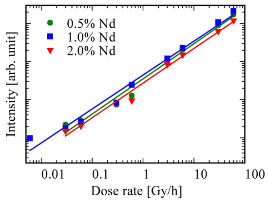 Dose-rate–response functions of 0.5, 1.0, and 2.0% Nd-doped BSO crystals.