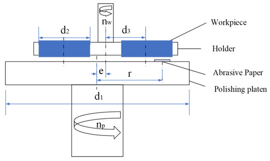 Four kinds of surface conditions were prepared in the experiment, including two kinds of textured surfaces, as well as a polished surface and ground surface as controls. The polished surface was fabricated using a polishing machine (MECATECH 250 SPI, PRESI, Eybens, France) to ensure an average surface roughness at around 0.02 μm. The ground surface was manufactured using a high-speed grinding machine (MT408, BLOHM, Hamburg, Germany) to guarantee an average surface roughness of approximately 0.80 μm. The polishing machine was also used to prepare the reticulated texture on the surface of the specimens, as shown in Figure 1. The diameter of the polishing platen is 250 mm. The envelope of the abrasive paper trajectory in the workpiece coordinate system is a ring. To enable the surface pattern to cover the whole surface of the workpiece, the eccentricity e and the position of sandpaper r should satisfy the following equations: