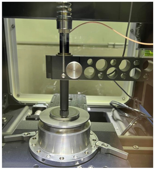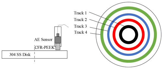 The test rig (MFT-5000, RTEC, San Jose, CA, USA) was applied to examine the tribological behaviors of the specimens under different pv values, as shown in Figure 2. According to ASTM G99-95a, the processing parameters of the pin-on-disk test are listed in Table 3. The specific pressure p was adjusted from (0.707 to 2.83) MPa by changing the applied load from (20 to 80) N, while the velocity v was regulated from (0.26 to 0.65) m/s by selecting a different friction track to change the center distance between the pin and disc, as illustrated in Figure 3. Therefore, the total pv is controlled from (0.185 to 1.85) MPa∙m/s. To obtain the dynamic signal during friction, an AE sensor (GM150, Qingcheng, China) was installed on the back of the CF-PEEK pin to obtain the AE signals, as shown in Figure 3. During the test, the pin and the AE sensor are tightly fitted by locking the nut. To ensure the reliability of the experiments, at least three tests of each group were repeated.