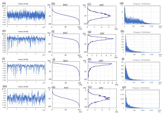 Analysis of the initial surface profiles: (a–d) polished surface; (e–h) textured surface −1; (i–l) textured surface −2; (m–p) ground surface.