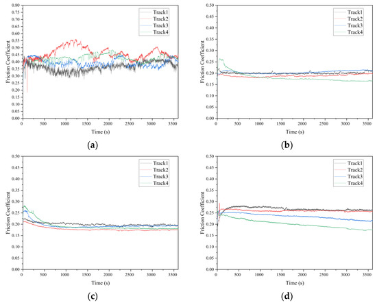 Friction coefficient evolution versus sliding time under different pv values: (a) polished surface; (b) textured surface −1; (c) textured surface −2; (d) ground surface.