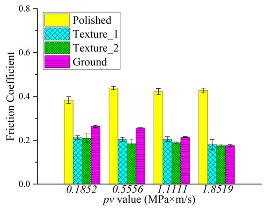 The typical evolution of the friction coefficient under different pv values from 0.185 to 1.85 MPa∙m/s are illustrated in Figure 6, and the mean value and standard deviation of the friction coefficient are shown in Figure 7. It can be indicated from Figure 7 that the polished surface has the highest friction coefficient, at around 0.40. The low surface roughness of the polished surface (Ra = 0.02 μm) leads to a high adhesive component of the tribological coupling [22]. This result is also attributed to the distribution of peaks and valleys on the surface for diverse structured surfaces. Table 4 shows that the polished surface has a small Rpk value at 0.015 μm; however, the other three surfaces have higher Rpk values at 0.16 μm, 0.13 μm and 1.0 μm. Moreover, the polished surface also has the highest density of the surface profile curve (see Figure 5a,d), which explains why the polished surface has smaller surface asperities. This also indicates that the microconvex with extremely small size is distributed on the polished surface. Therefore, during the sliding process, the small hard SS particles fall off by the physical interlocking between the polished surface asperities [23] and embed into the contact surface between CF-PEEK blends and the SS disk, resulting in three-body wear. In addition, the polished surface has a small Rvk value at −0.1 μm and a large Mr2 value at 90.5%, while the other three surfaces have higher Rvk values at 0.44 μm, 0.92 μm and 1.35 μm and lower Mr2 values at 83.4%, 79.8% and 87.8%, respectively, as listed in Table 4. It is inferred that the chip storage capacity of the polished surface is lower than that of the other three surfaces. There is some wear debris sliding or rolling randomly between the polished SS disk and CF-PEEK pin, leading to the friction coefficient fluctuating significantly with increasing processing time, as shown in Figure 6a. The mean friction coefficient value of the polished SS disk fluctuates between 0.38 and 0.42 as the pv value increases from 0.185 to 1.85 MPa∙m/s, which means that the friction coefficients of the smooth, hard SS surface against the rough, soft CF-PEKK surface remain almost unchanged with the load.
