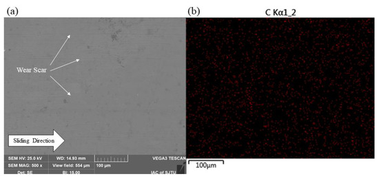 The surface morphologies of the worn SS disks and CF-PEEK pins were examined using SEM and the element contents on the surfaces were detected by EDS, as shown in Figure 12 and Figure 13. Several lines parallel to the friction direction are marked with white arrows in Figure 12a, indicating that there are scratches caused by abrasive wear on the polished SS disk. The EDS map of the polished surface specimen shows that there is almost no carbon element on the surface, which represents the main element of CF-PEEEK, while some iron element with a mass fraction of approximately 4.0% is found on the surface of the CF-PEEK pin, as shown in Figure 12b and Figure 13b. It is verified that the hard SS asperities are scraped off by the CF-PEEK pin and embedded in the soft polymer. It can be indicated that there is almost no transfer film on the polished SS surface; however, the three-body abrasive wear caused by SS debris has a significant effect on the high friction coefficient and AE RMS value of the polished surface.