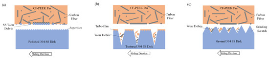The sketches of the wear mechanism when CF-PEEK pins slide against textured SS disks, polished and ground disks are proposed and illustrated in Figure 14. As shown in Figure 14a, when the CF-PEEK pin slides against the polished SS disk which has the lowest surface roughness as shown in Figure 5a,d, the worn debris of PEEK, CF and SS hard particles exist between the friction interfaces. When some SS hard particles are embedded into the PEEK matrix, others remain between the interface due to the support of CF strips enclosing the hard particles, resulting in high friction force in the sliding direction (as shown in Figure 6a and Figure 7) and scratch scars on SS disks (as shown in Figure 12a). It is proven by the EDS maps (see Figure 13a) that iron element exists on the surface of CF-PEEK pins.