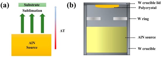 Figure 1a shows the diagram of the preparation process of AlN crystals by use of the PVT method. The preparation process of AlN crystal by the PVT method can be simply summarized as sublimation and recondensation. Commercial AlN powders were purified twice at high temperatures and utilized as sources in the general preparation of AlN crystals. First, in a nitrogen atmosphere, AlN source was sublimated at high temperature to produce vapor Al and N2. Afterword, these vapors moved from high to low temperature in the direction of a temperature gradient (ΔT). Finally, those vapors continuously collided, diffused, and were absorbed and desorbed on the substrate. The whole process can be briefly described by the following reaction equation [5,19]: