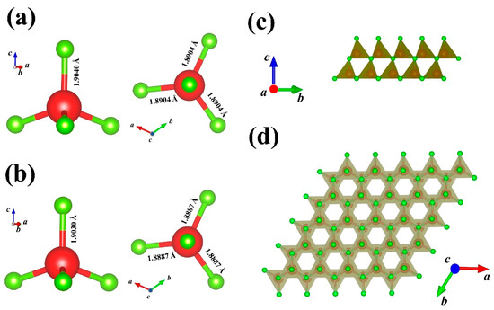 The molecular structure of the seeds of c-plane (a) and m-plane (b), and the crystal structure at different viewing angles (c,d).